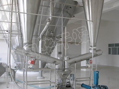 離心噴霧干燥設備是一種適用于乳濁液、懸浮液、糊狀物 、溶液等液體干燥的專用干燥設備。空氣通過過濾器和加熱器,進入噴霧干燥頂部的空氣分配器,熱空氣呈螺旋狀均勻進入干燥。料液由料液槽經過濾器由泵送至干燥器頂部的離心霧化器,使料液噴成小的物狀液滴,料液和熱空氣并流接觸,水份迅速蒸發,在短時間內干燥為成品。成品同干燥塔底部和旋風分離器排出, 廢氣由風機抽出排出。